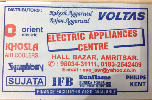 My family is buying electronics from electric appliances centre since 30 years. From Fan to air conditioners, juicers mixer grinder to hair straightener, we trust their prices and services. It’s the oldest showroom in Amritsar which is consistent in their services. They keep their customers before anyone else. Even now after moving to Italy, I consult them for every purchase be it my AC or microwave. They are always one call away. Thanks and keep up the good work 👏🏼👏🏼👏🏼.