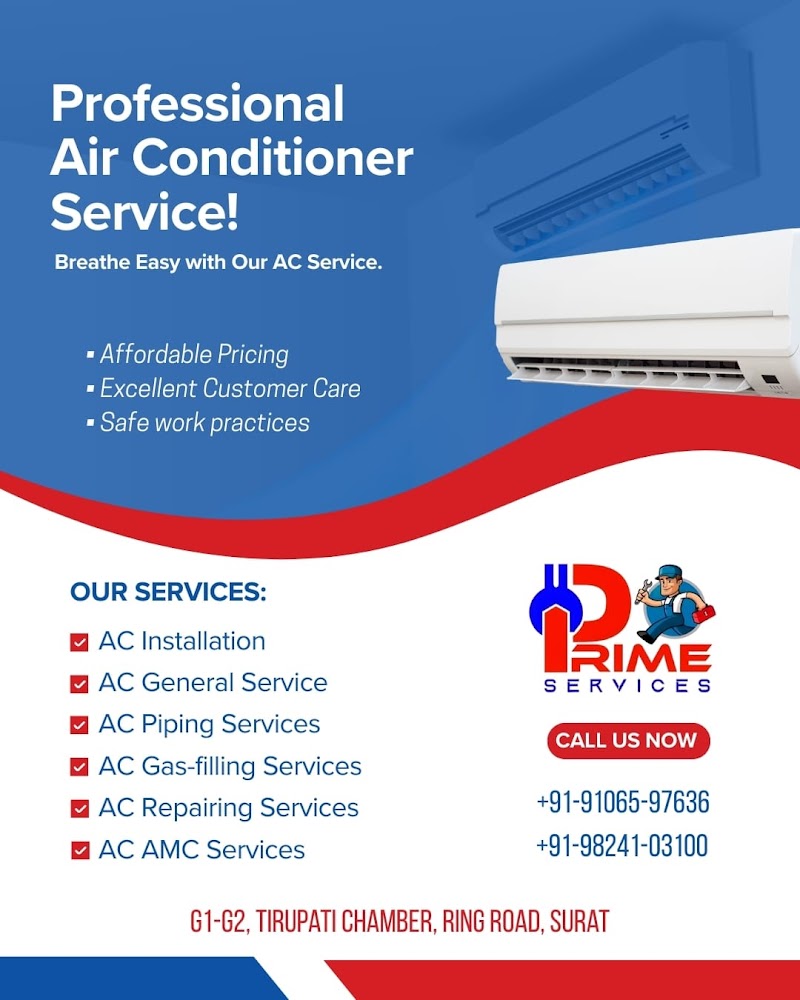 Prime Services - Best AC Service Center is a trusted and professional AC repair and servicing company based in Sagrampura, Surat. Specialising in a comprehensive range of AC services including Split AC Repair, Window AC Repair, AC Gas Filling, AC Service, they cater to both residential and commercia...